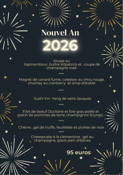 Menu spécial Nouvel An disponible à partir de 19h00 le 31 et 12 h00 le 1er Janvier